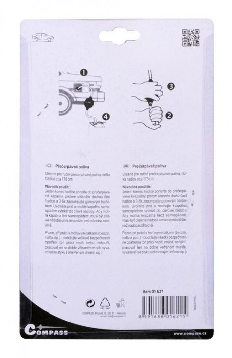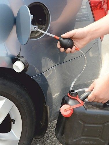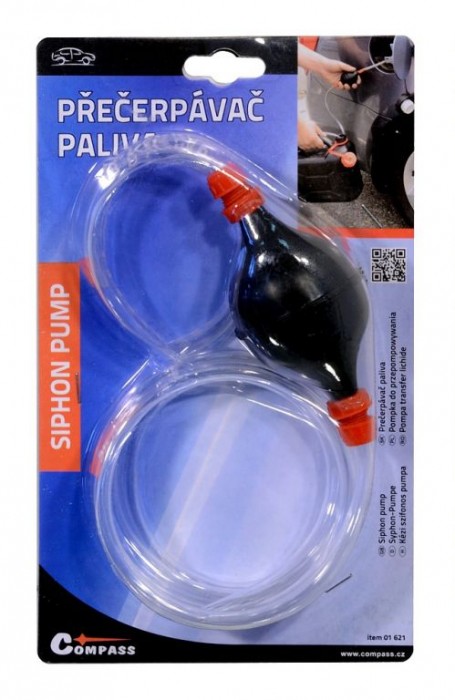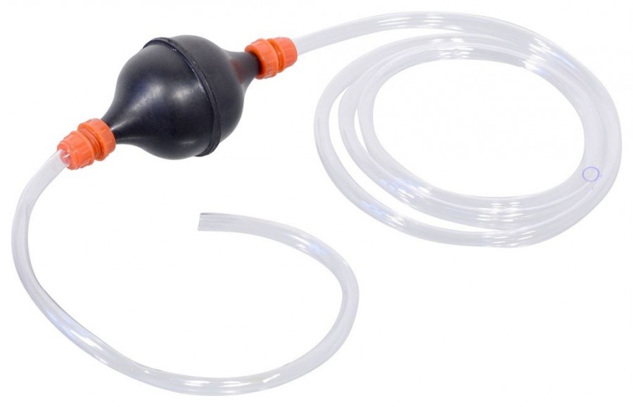 Přečerpávač, pro ruční přečerpávání paliva s hadicí délky cca 180 cm. Uvolněte prst a nechte kapalinu samospádem vytékat do cílové nádoby. Aby mohla kapalina téct samospádem, musí být cílová nádoba umístěna níže, než nádoba zdrojová.