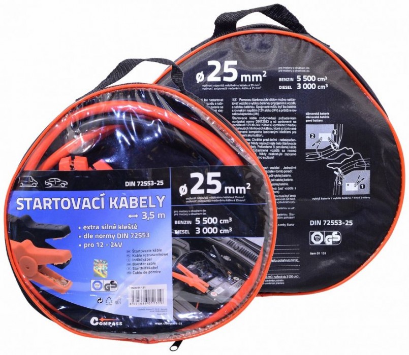 Tyto startovací kabely jsou určeny pro nouzové startování vozidel s benzinovým motorem do objemu 5500 cm3 nebo s naftovým motorem do 3000 cm3. Délka 3,5 metru, vodivostí odpovídá měděnému kabelu o průměru 25 mm2. Vysoce kvalitní startovací kabely odpovídají požadavkům evropské normy DIN 72553-25 a jsou způsobilé pro napětí od 12V do 24V. Kabely jsou vyrobeny z mědí potažených hliníkových kabelů, které jsou izolovány a vybaveny kompletně izolovanými kleštěmi pro připojení k akumulátoru. Pomocí startovacích kabelů lze nastartovat vozidlo s vybitou baterií připojením k vozidlu s nabitou baterií. Spojovány mohou být pouze baterie se stejným napětím (12V nebo 24V) a přibližně stejnou kapacitou (Ah).