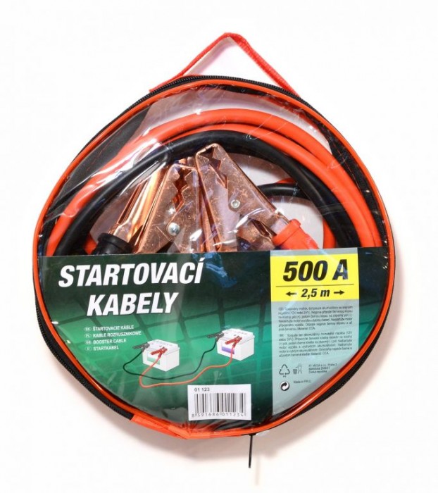 Klasické startovací kabely, barevně označené, se svorkami na akumulátor. Uzavíratelné balení, snadné uložení startovacích kabelů zpět do praktického, na zip uzavíratelného, obalu.
