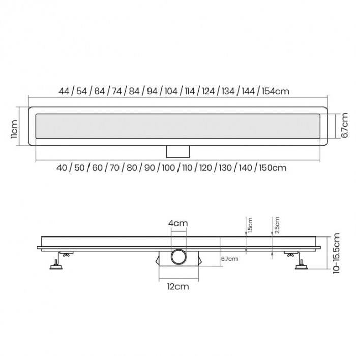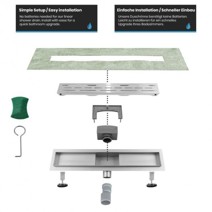Proměňte svou koupelnu v oázu stylu a inovací díky našim vynikajícím lineárním sprchovým odtokům. Nerezová ocel nejvyšší kvality, umně kartáčovaná, v kombinaci s pískovaným hlavním tělem. Design vaší koupelny si zaslouží něco výjimečného, proto jsou naše sprchové odtoky navrženy tak, aby nejen zaujaly, ale také inspirovaly svou odolností. Díky zapuštěnému povrchovému materiálu vám zaručujeme výrobek, který obstojí ve zkoušce času. Instalace je rychlá, nekomplikovaná a bez nutnosti použití baterií. Mysleli jsme na vše, abyste se mohli bez obav soustředit na to podstatné. Vylepšete tvar a funkci svého sprchového koutu pomocí našeho elegantního a odolného lineárního sprchového odtoku, který dodá vaší každodenní rutině sofistikovanost.