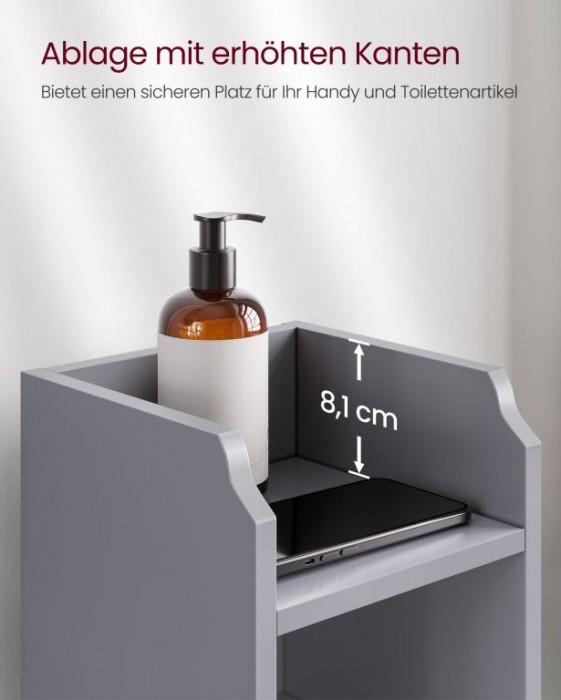 Vytvořte si v koupelně útulný a přehledný prostor díky této úzké skříňce v elegantní šedé barvě. Skvěle zapadne i do menších koupelen, kde poskytne místo na všechny nezbytnosti a zároveň nezabere téměř žádné místo. Každá věc má své místo – od dekorací až po hygienické potřeby.