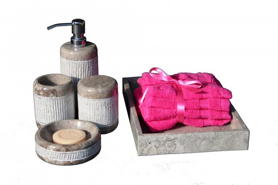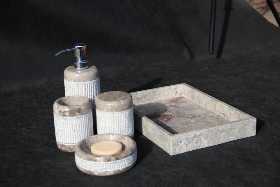 Kamenná koupelnová sada z přírodního kamene má nadčasový design. Hodí se do každé koupelny. Každý kus je originál, proto se každý kus může lišit rozměry, odstínem barvy i rýhováním kamene.