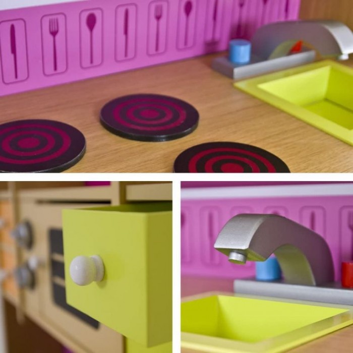 Máte doma malou kuchařku? S touto dřevěnou kuchyňkou jí určitě uděláte velkou radost. Podpoříte dětskou představivost a vynalézavost. Kreativita malých dětí nezná hranic. Tato barevná a realistická kuchyňka byla vyrobena s velkou láskou k detailům z desky MDF a bude určitě novou oblíbenou hračkou vašeho dítěte.