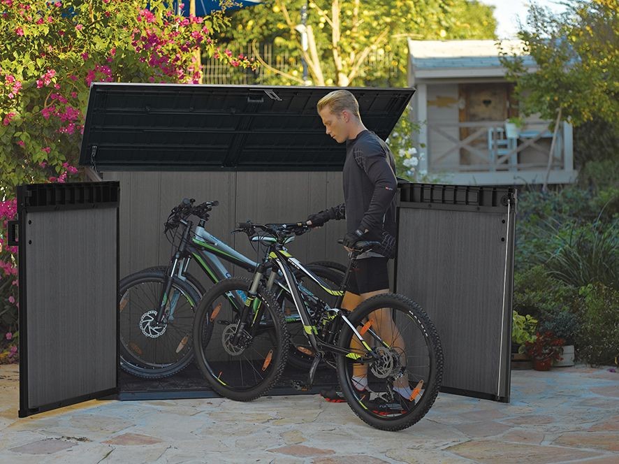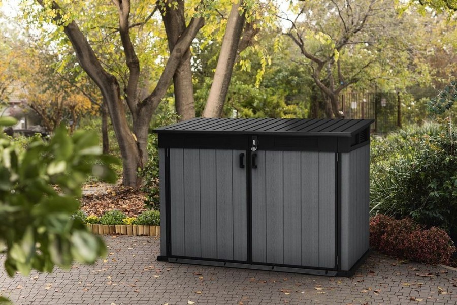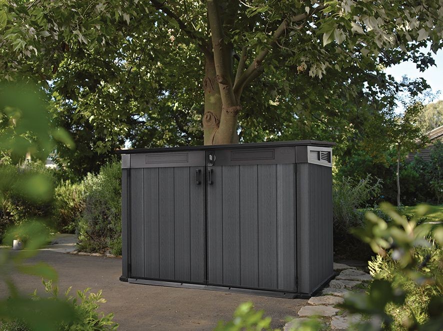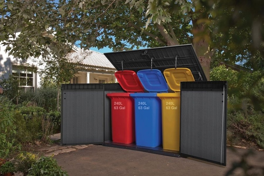 Bez problému můžete také uložit uvnitř: barbecue gril, podušky, konve, květináče, hračky a mnohé další předměty. Ideální volba pro uskladnění popelnic. Skříň pojme tři popelnice o objemu 240 L, součástí balení jsou i řetízky, díky nimž se víka popelnic otevírají spolu s víkem skříně. Zabudovaná je i ventilace pro prevenci zápachu.