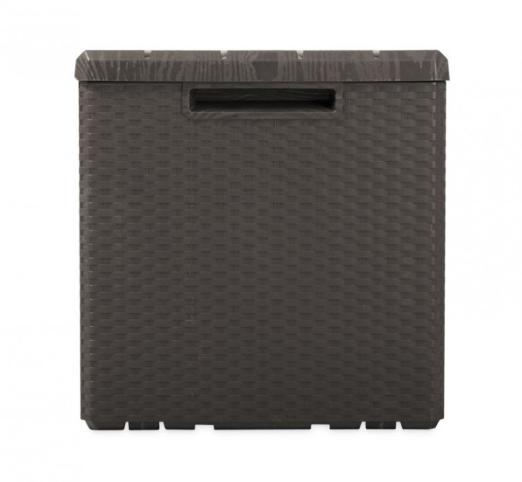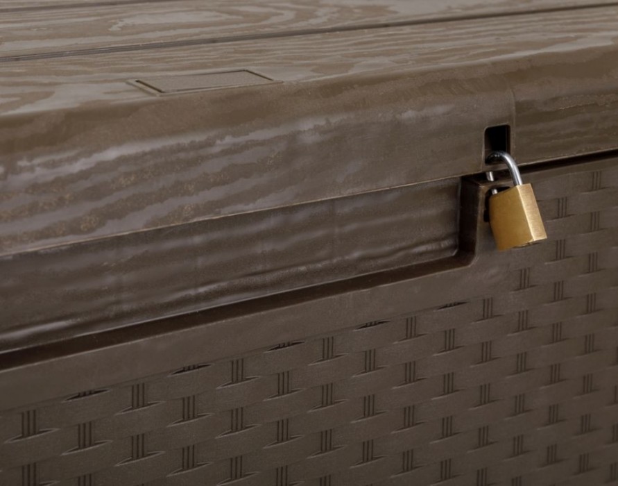 ELEGANTNÍ DESIGN A BEZPEČNOST: Imitace ratanového povrchu na bočních stěnách a dřevěného na víku dodává boxu luxusní vzhled, který se bude skvěle hodit k jakémukoli zahradnímu designu. Jeho hnědá barva je vkusná a neutrální, takže se dokonale sladí s okolím. Tento box má také možnost uzamčení, což zajišťuje bezpečné uložení Vašich cenností a nábytku.