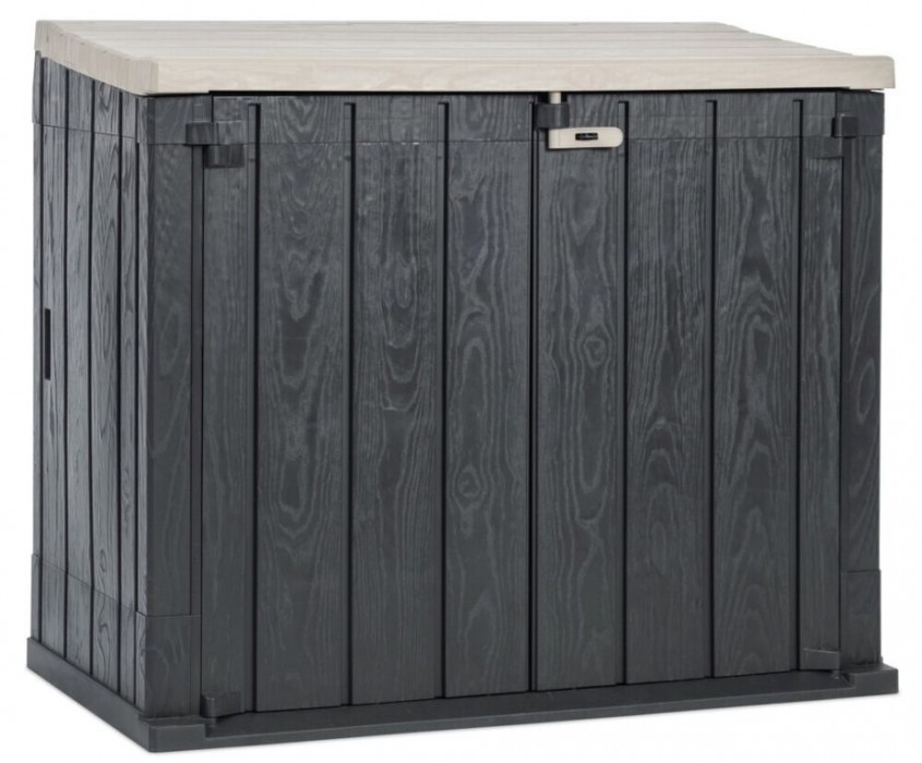 SNADNÉ OTEVÍRÁNÍ A PŘÍSTUP: Dvoukřídlé dveře a otevírací víko nabízí mnoho možností využití. Bez námahy a s elegancí zvládnete přístup i manipulaci s obsahem. Šikmý práh dále usnadňuje přístup dovnitř, umožňuje snadné umístění popelnic či jiných objemných předmětů. Zajímavé barevné provedení kombinuje grafitové stěny a světle šedé víko.