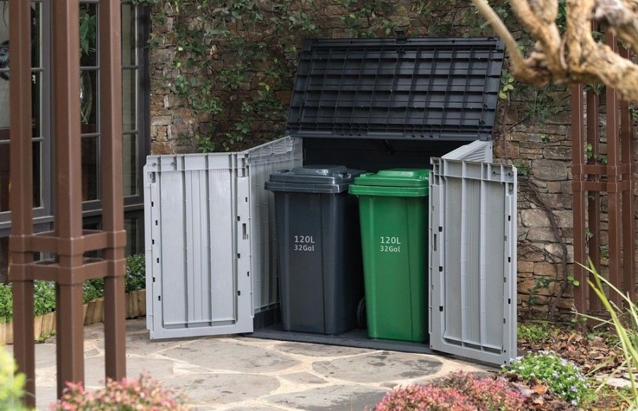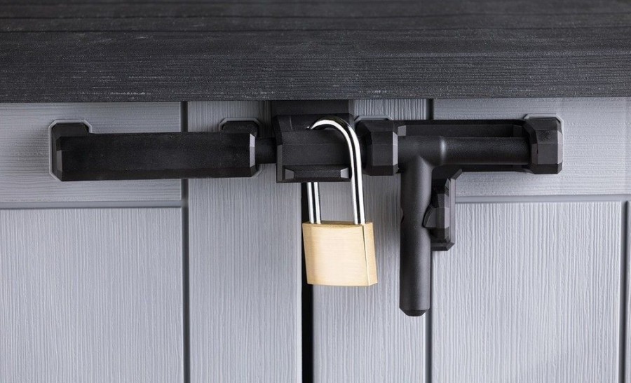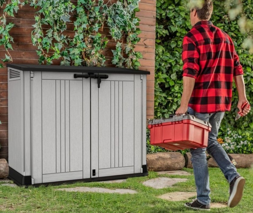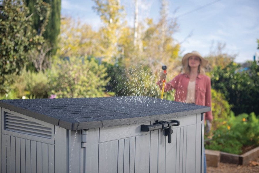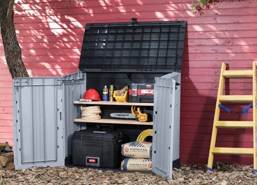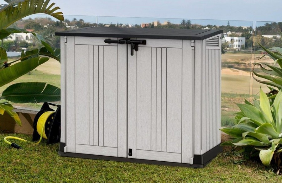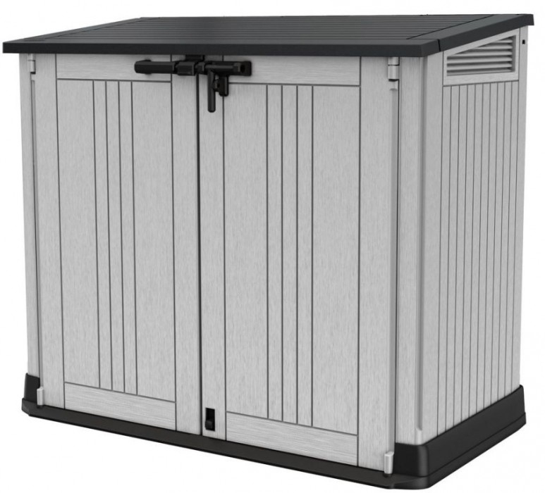STORE IT OUT MIDI v novém designu je vyrobena z kvalitnějších a pevnějších materiálů, které zaručují ještě delší životnost produktu. Úložná skříňka se vyznačuje jednoduchým a elegantním designem, struktura povrchu připomínající přírodní dřevo. Úložná skříň se hodí všude, kde je nutné uschovat zahradní doplňky, nářadí nebo např. popelnice (dvě popelnice o objemu 120l). Robustní rám chrání uložené předměty proti vlhkosti, zatímco vysoce kvalitní plastové materiály zajistí trvanlivost výrobku po mnoho let. Otevřít lze shora či zepředu, je uzamykatelná. Odvětrávání.