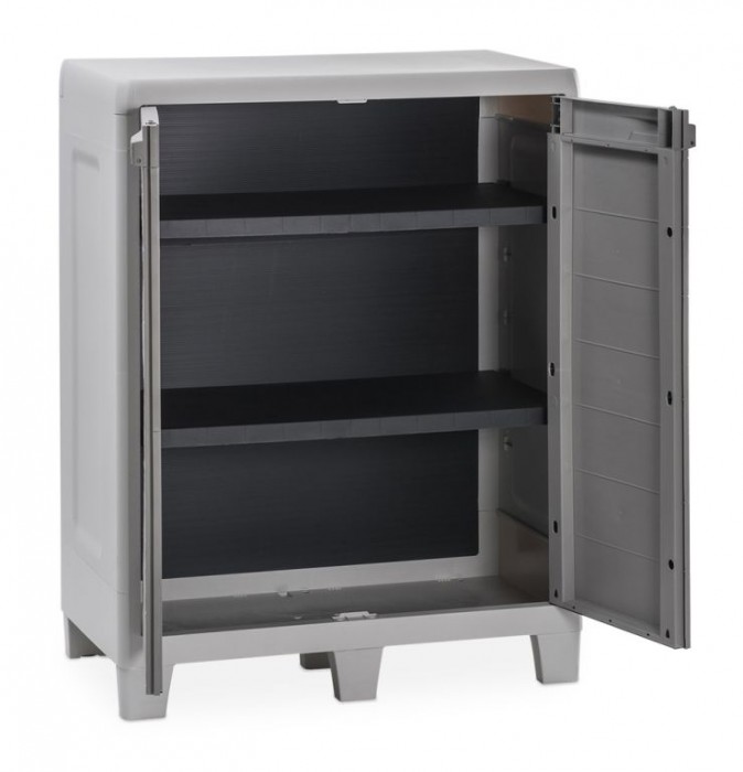 NASTAVITELNÉ POLICE: S dvěma nastavitelnými policemi, z nichž každá unese až 30 kg, můžete snadno uspořádat veškeré zahradní vybavení a nástroje s důvěrou v jejich bezpečnost. Montáž je snadná pomocí běžného náčiní, s možností upevnění ke zdi pro ještě větší stabilitu. Rukojeti v horní části dvířek usnadňují otevírání.