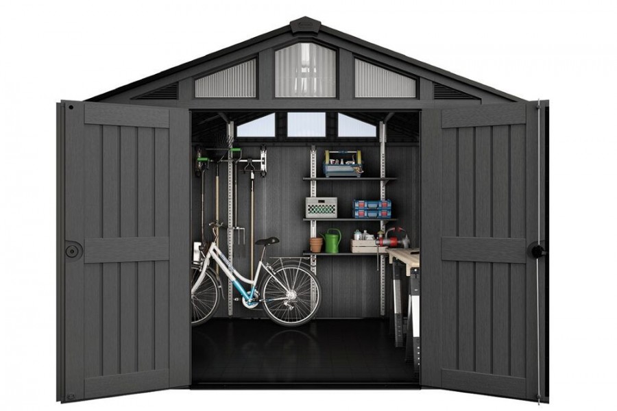 Se širokými dvojitými dveřmi můžete do domku uskladnit jízdní kola, sekačku na trávu, nářadí, truhlářskou dílu či spoustu dalších zahradních doplňků.
