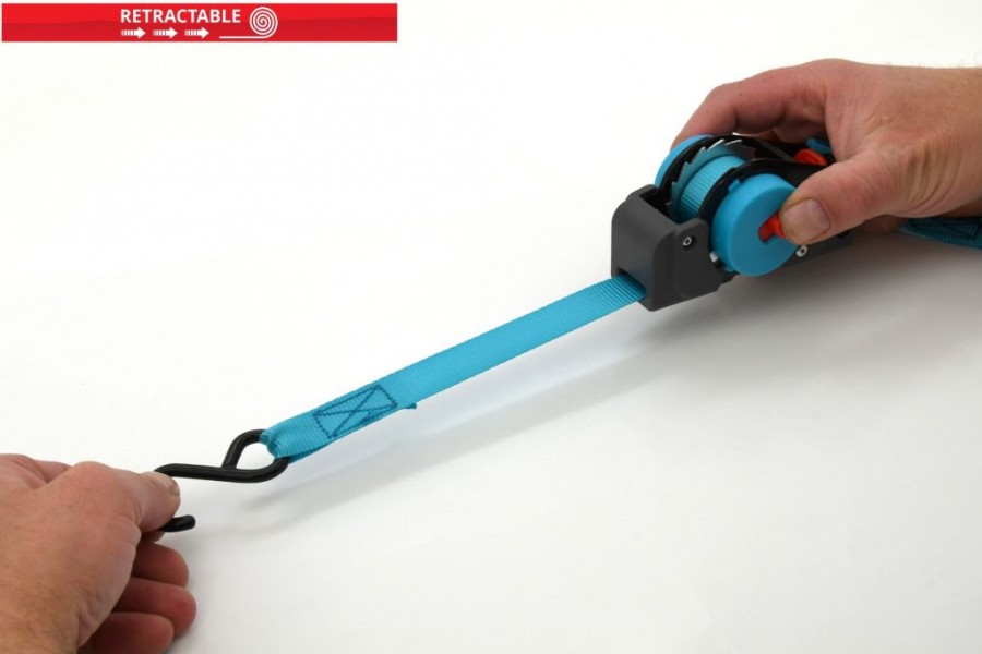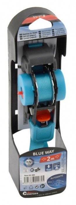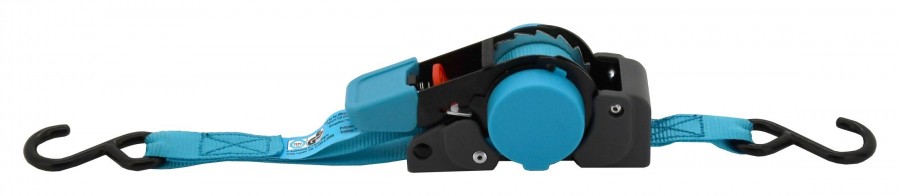 Samonavíjecí upínací popruh k zajištění předmětů, zavazadel, nebo nákladu. Pro upnutí se využívá celokovová ráčna s jisticím mechanizmem. Ráčna je navíc opatřena samonavíjením, kdy po stisknutí tlačítka navíjí zpět popruh po celé délce. Konce popruhů jsou osazeny kovovými háky s povrchem z tvrzeného plastu.