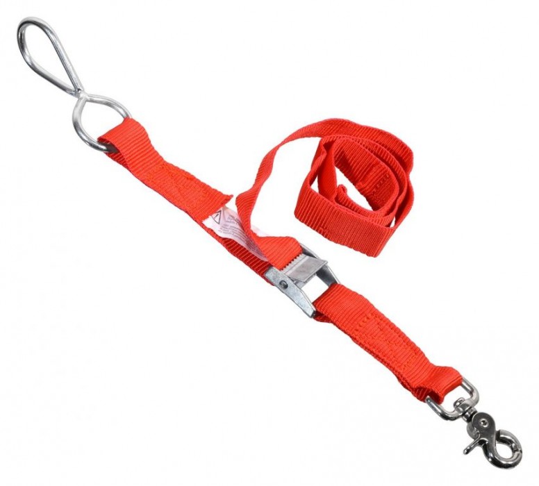 Popruh je vybaven okem pro upnutí do jedné a karabinou do druhé části zámku dveří a sponout pro dotažení. Návod k použití: Kovové oko popruhu zavěste (zacvakněte) do zámku na zadních dveřích a druhou část upevněte pomocí karabiny k uzavíracímu mechanismu. Nakonec popruh přitáhněte pomocí spony v prostřední části.