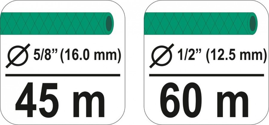 - pro hadici: 1/2 "o délce 60 metrů a 5/8" délky 45 m.