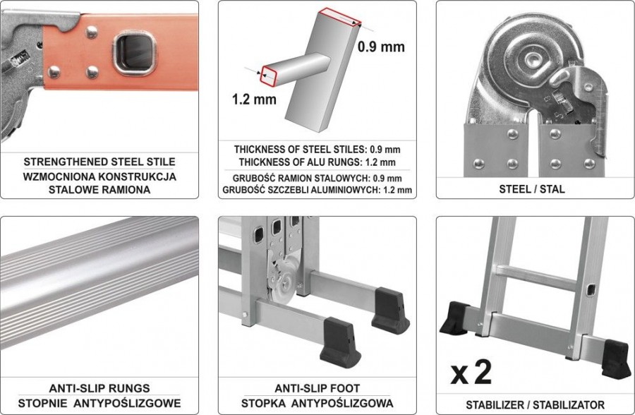 Víceúčelový skládací žebřík, splňuje požadavky evropské normy EN131. Skládá se ze čtyř segmentů spojených pevnými klouby. Všechny spoje mají zámky, které umožňují snadno měnit konfiguraci žebříku. Boky žebříku jsou vyrobeny z ocelových profilů, které jsou pevnější než hliník stejného provedení. Příčky jsou pak hliníkové a jejich povrch je protiskluzový. Pro vysokou stabilitu je na každé straně žebříku stabilizátor s gumovými nohami. Žebřík se snadno přepravuje nebo skladuje.