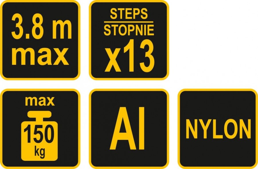 Jednotlivé stupně žebříku jsou opatřeny protiskluznou vrstvou a zvyšují tak bezpčnost použití. Značení pro maximální úroveň označuje maximální bezpečnou pracovní výšku. Nožičky žebříku jsou opatřeny gumou a zajišťují dobrou přilnavost k zemi.