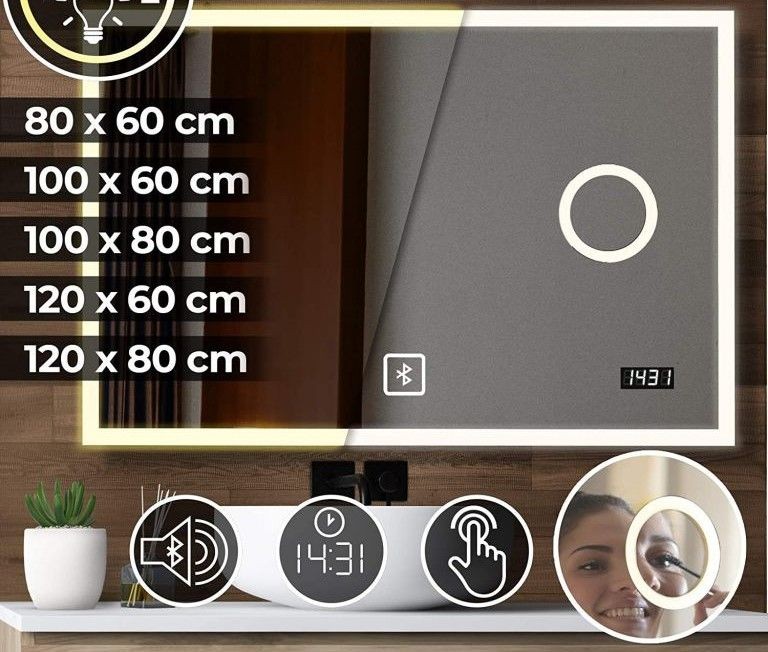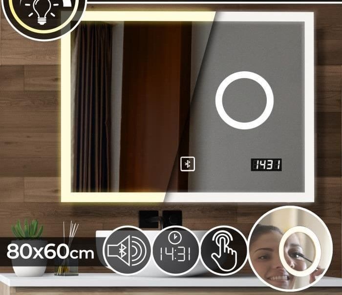 Toto koupelnové zrcadlo s osvětlením má digitální hodiny a bluetooth reproduktor, stejně jako kosmetické zrcadlo. Dotykové zrcadlo poskytují speciální okolní osvětlení, které odpovídá vaší náladě. Nastavitelné od teplého po studené světlo. Toto zrcadlo je bez mědi a obzvláště odolné proti vlhkosti.