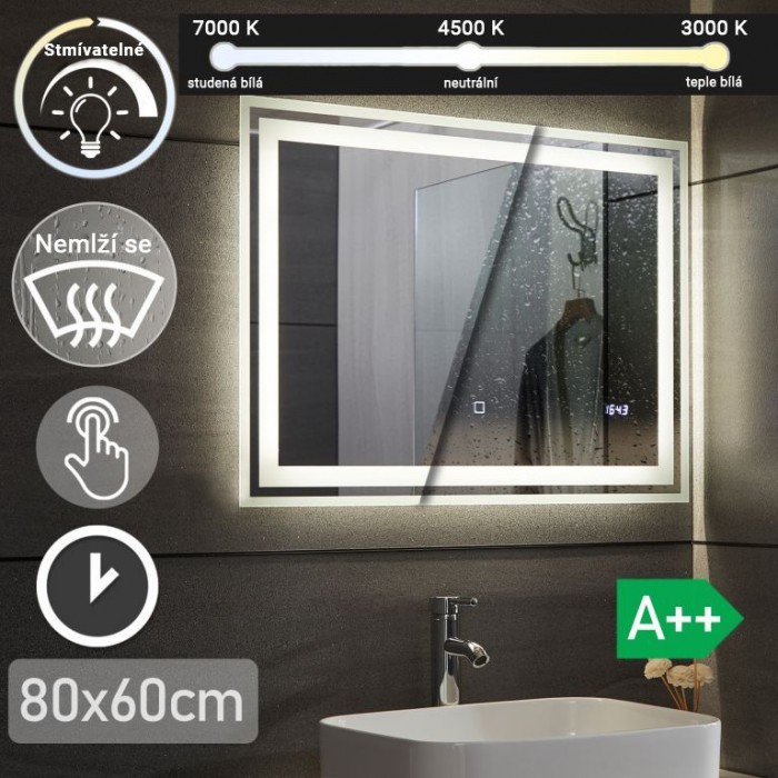 Tato koupelnová zrcadla s osvětlením jsou vybavena digitálními hodinami s nastavením data a funkcí proti zamlžení, která se automaticky aktivuje při zapnutí světel LED. Zrcadla s dotykovým ovládáním a funkcí stmívání poskytují speciální osvětlení místnosti podle vaší nálady: teplé 3000K, studené 7000K nebo dokonce neutrální bílé LED 4500K.